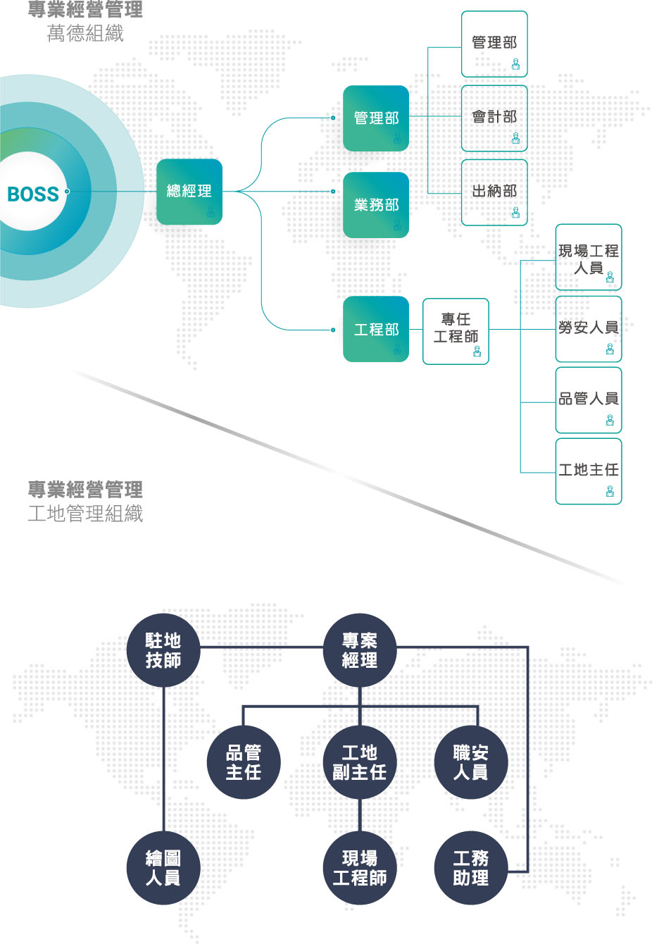 萬德工程團隊涵蓋各種專業領域,藉由縱向管理及橫向協調,彼此間分工合作且職掌劃分清晰。